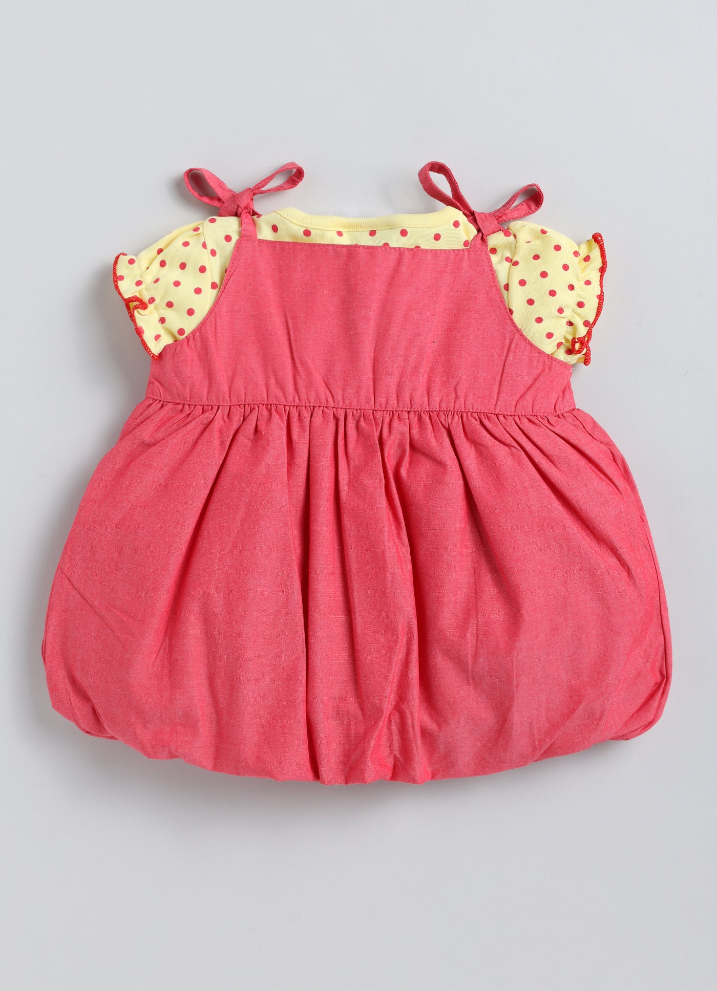 This adorable Girls skirt top set features a charming Elephant applique with short sleeves, paired with a vibrant Pink/Yellow balloon skirt. A delightful combination that is ideal for the summer season. The dress boasts comfortable tie-up shoulders and a printed top, making it both easy to wear and visually appealing.